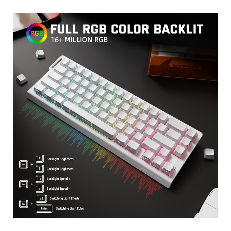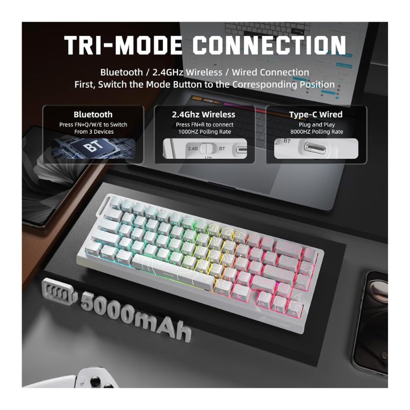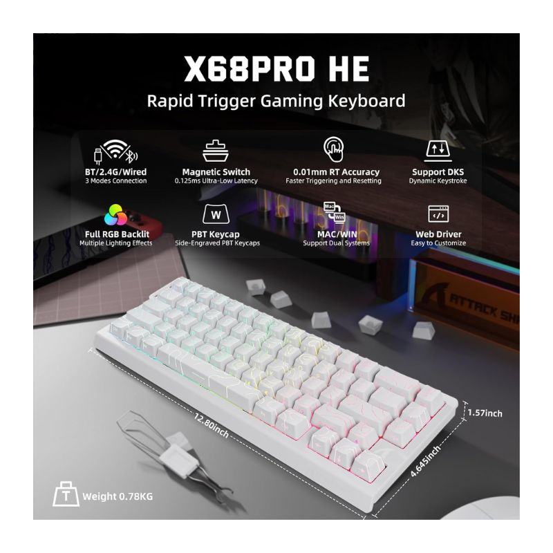 Engineered for zero-latency performance, the X68 PRO HE supports an ultra-responsive 8K Polling Rate in wired mode, ensuring your inputs are registered with maximum frequency. Its versatile Triple-Mode connectivity (Bluetooth, 2.4GHz Wireless, and USB-C Wired) allows for seamless switching between devices. The keyboard is finished with vibrant RGB backlighting, hot-swappable switches for easy customization, and a sleek white aesthetic.