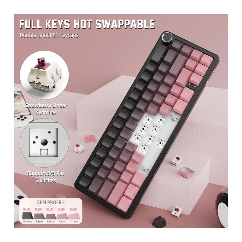 The X66 offers ultimate flexibility with Triple-Mode connectivity (Bluetooth, 2.4G Wireless, and USB-C), ensuring low-latency performance across all your devices. Built with a Gasket structure for a cushioned typing experience and Hot-Swap technology, you can easily customize your linear switches without soldering. The Side-Printed PBT keycaps not only look sleek but are highly durable, allowing the vibrant RGB lighting to shine through brilliantly.