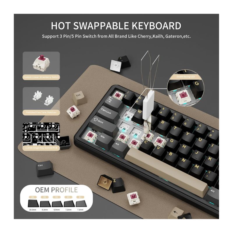 The X66 offers ultimate flexibility with Triple-Mode connectivity (Bluetooth, 2.4G Wireless, and USB-C), ensuring low-latency performance across all your devices. Built with a Gasket structure for a cushioned typing experience and Hot-Swap technology, you can easily customize your linear switches without soldering. The Side-Printed PBT keycaps not only look sleek but are highly durable, allowing the vibrant RGB lighting to shine through brilliantly.