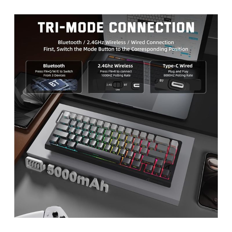 Built for zero-latency performance, the X68 PRO HE supports an ultra-fast 8K Polling Rate (8000Hz), delivering your inputs to the PC at lightning speeds. It offers Triple-Mode Connectivity (Bluetooth, 2.4GHz Wireless, and Wired) and features a Hot-Swap PCB for easy customization. Wrapped in a stunning “Black Contours” design with vibrant RGB backlighting, this keyboard offers the perfect balance of aesthetics and competitive advantage.