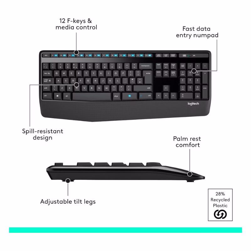 The Logitech MK345 Wireless Combo delivers comfort and reliability for your desktop or laptop setup. It features a full-sized keyboard designed for comfortable typing, complete with an integrated textured palm rest. The included right-handed wireless mouse is shaped for ergonomic support.