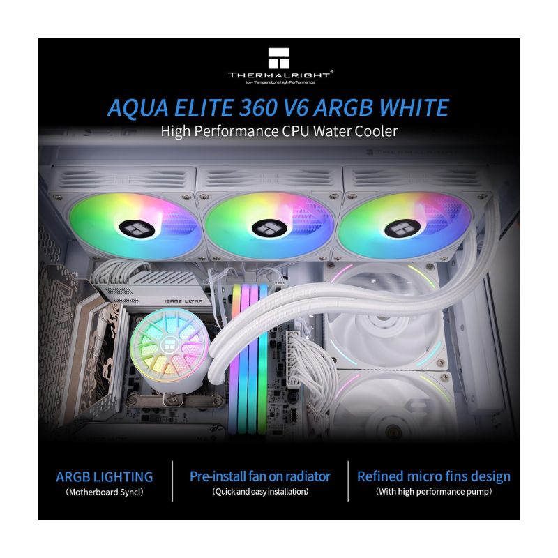Keep your processor cool under pressure with the Thermalright Aqua Elite 360 V6 ARGB Liquid Cooler (White). This high-performance AIO (All-In-One) liquid cooling system is designed for enthusiasts who demand superior thermal dissipation and a clean, white aesthetic. Featuring a massive 360mm radiator and three powerful ARGB fans, it provides the perfect balance of airflow and silence for high-end gaming and professional workstations.